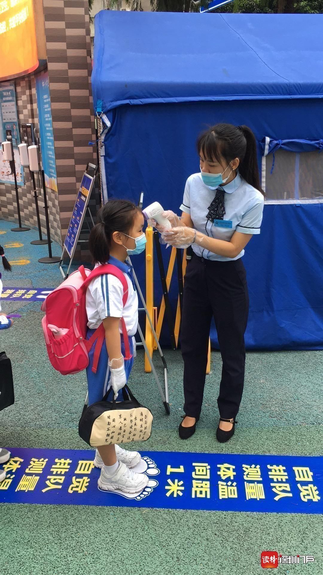記者了解到,為了保障復(fù)學(xué)工作順利進(jìn)行,蘭陵學(xué)校做了充分準(zhǔn)備:提前做好雨天相關(guān)準(zhǔn)備,昨天已把紅外線體溫檢測(cè)系統(tǒng)安置在架空層,避免因測(cè)體溫造成淋雨的現(xiàn)象;與坪地街道各相關(guān)部門(mén)聯(lián)防聯(lián)控,確保學(xué)生上學(xué)、放學(xué)安全;實(shí)行年級(jí)錯(cuò)峰上學(xué)(7-9年7:15-7:30上學(xué);4-6年級(jí)7:30-7:45上學(xué),1-3年級(jí)7:45-8:00),錯(cuò)峰上、下課,減少聚集;體溫三道關(guān):出家門(mén)前,入校園時(shí),進(jìn)班級(jí)里……各項(xiàng)工作有序進(jìn)行。