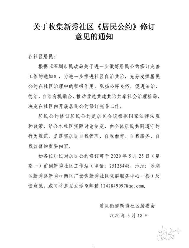南方網(wǎng)2020年5月18日訊 垃圾分類、文明養(yǎng)犬、廣場(chǎng)舞不擾民……近日,一則社區(qū)居民公約征求意見稿貼在了深圳羅湖黃貝街道新秀社區(qū)的公告欄,成為居民們談?wù)摰臒衢T話題。