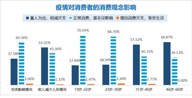 調(diào)研發(fā)現(xiàn),在疫情影響下,60.36%消費(fèi)者選擇正常消費(fèi),37.58%的消費(fèi)者選擇量入為出,削減開支;而受疫情影響收入下降的受訪者中,大部分人選擇“削減開支”,增加消費(fèi)支出的僅占2.06%。