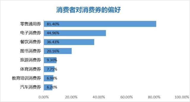 調(diào)研發(fā)現(xiàn),消費(fèi)券對于促進(jìn)消費(fèi)有較大作用。42%的消費(fèi)者希望拿到消費(fèi)券,47%的消費(fèi)者持中立態(tài)度,但表示如果得到了消費(fèi)券的話更愿意主動去消費(fèi)。在各種類型的消費(fèi)券中,消費(fèi)者喜歡的前三種類型分別是零售通用券、電子消費(fèi)券和餐飲消費(fèi)券,消費(fèi)者選擇的占比分別為81.40%、44.96%和36.43%。