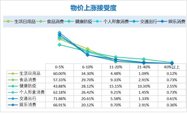 調(diào)研發(fā)現(xiàn),對于生活日用品、食品消費(fèi)、個人形象消費(fèi)、交通出行、娛樂消費(fèi)等各項(xiàng)消費(fèi),大部分消費(fèi)者能接受的價(jià)格上漲幅度在5%以內(nèi)。而健康防疫物資方面,43.88%的消費(fèi)者接受5%以內(nèi)的漲幅,28.12%的消費(fèi)者接受6-10%的漲幅,15.15%的消費(fèi)者接受11-20%的漲幅,即消費(fèi)者能接受防疫物資價(jià)格較大幅度的上漲。