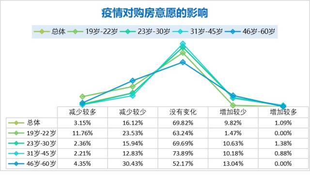通過對不同年齡段消費(fèi)者的購房、購車意愿調(diào)研發(fā)現(xiàn),19-22歲及46-60歲的受訪者因疫情影響購房、購車意愿變化相對較大,意愿減少人數(shù)占比較多。