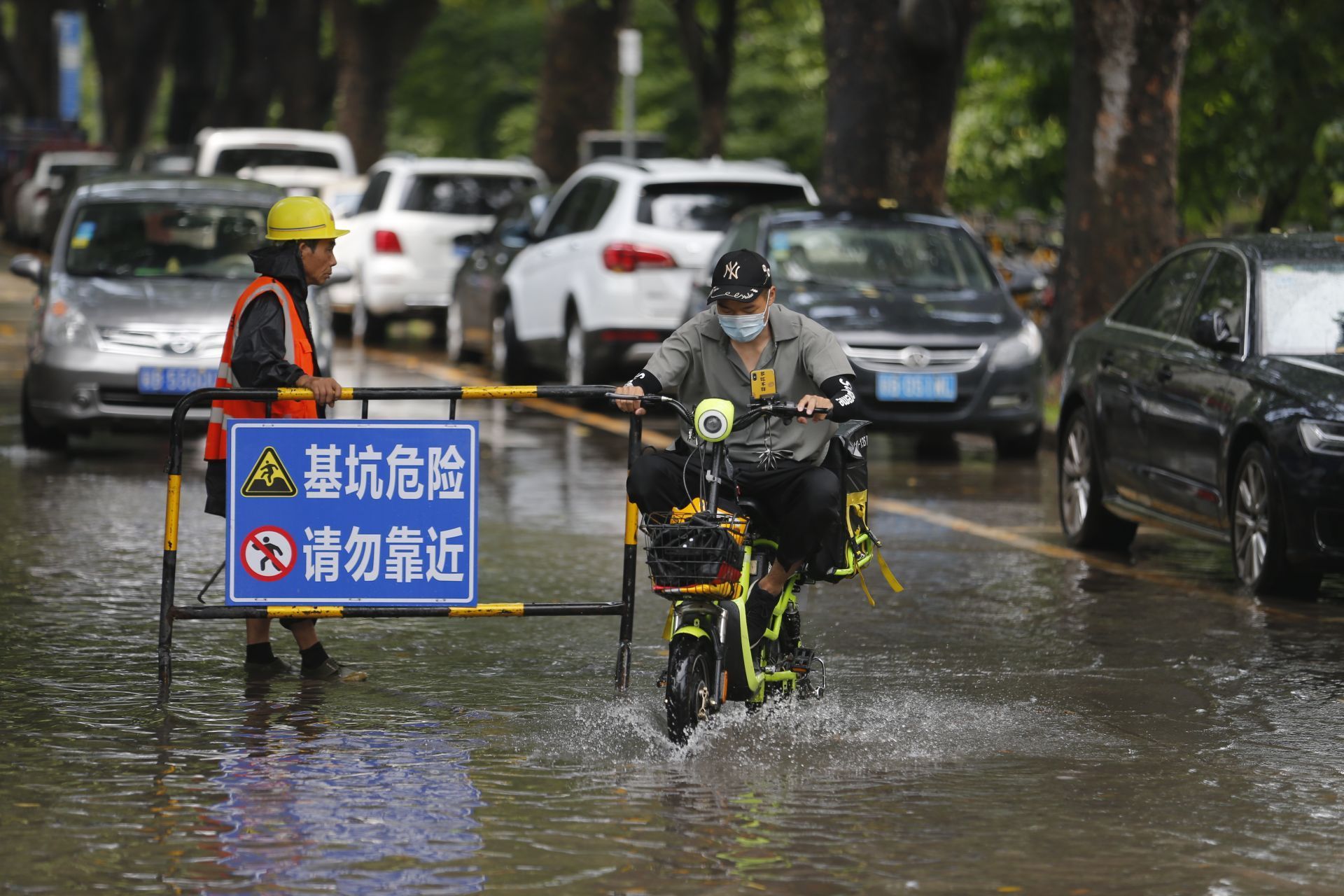 2020年5月26日中午13:46分,商報(bào)東二路,短時強(qiáng)降水導(dǎo)致路面水浸,一位騎士經(jīng)過水浸路面。