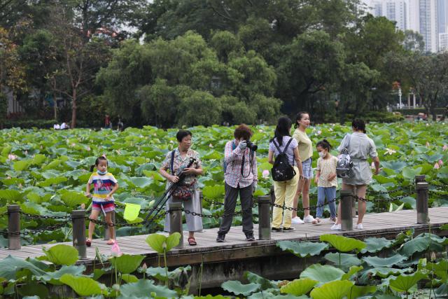 ▲眾多市民、游客來到公園觀賞荷花。