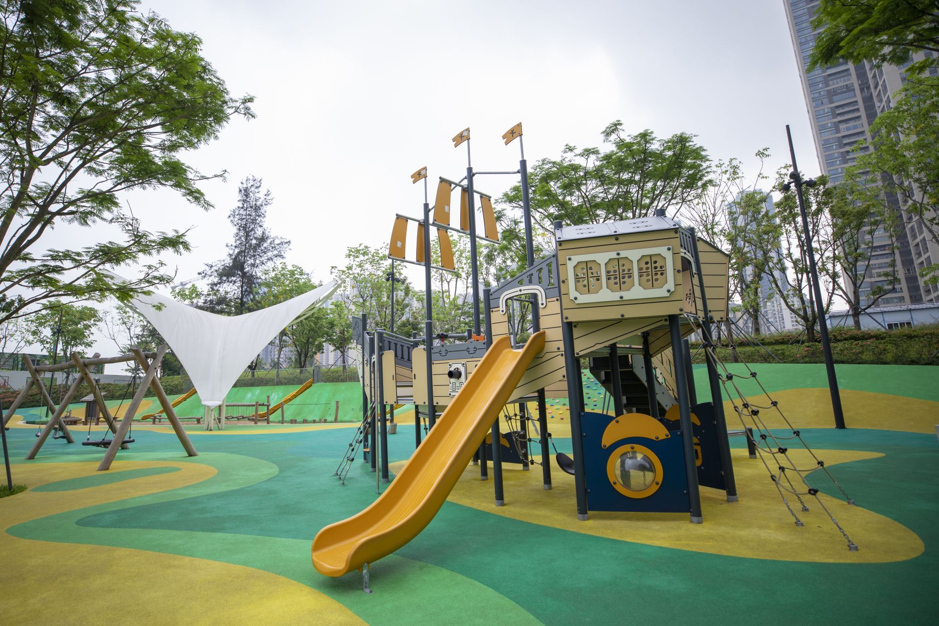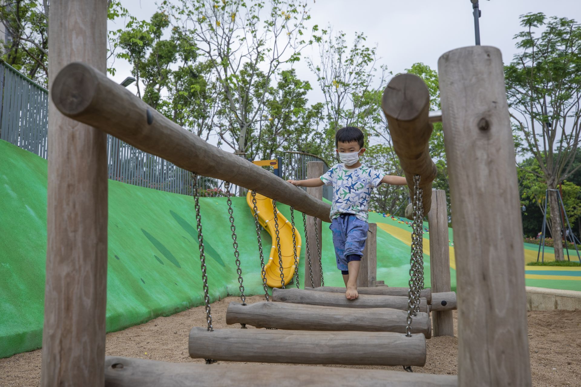 28日,記者從萬象天地旁的沙河西路進(jìn)入位于大沙河生態(tài)長(zhǎng)廊中的大沖公園,這里設(shè)置了專門的兒童游樂區(qū),有三處長(zhǎng)短不一的趣味滑梯、沙池、海盜船、攀爬墻等設(shè)施。
