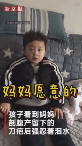 視頻中,孩子無意中看到媽媽剖腹產(chǎn)生他時(shí)留下的刀疤