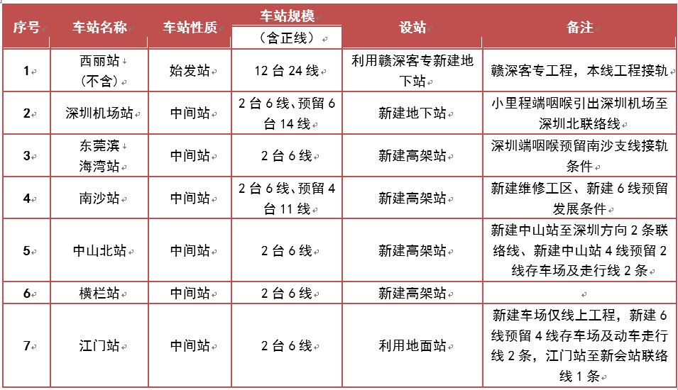 項(xiàng)目共設(shè)西麗(不含)、深圳機(jī)場、濱海灣、南沙、中山北、橫欄、江門等7個(gè)車站,其中西麗、深圳機(jī)場為地下站,濱海灣、南沙、中山北、橫欄為高架站,江門站為地面站。