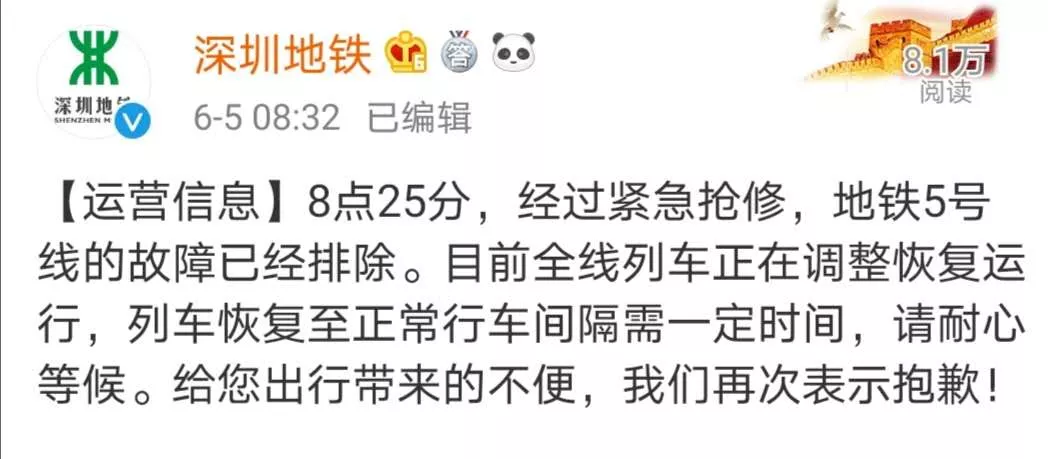 @深圳地鐵發(fā)布信息:8點25分,經(jīng)過緊急搶修地鐵5號線的故障已經(jīng)排除。目前全線列車正在調(diào)整恢復運行。