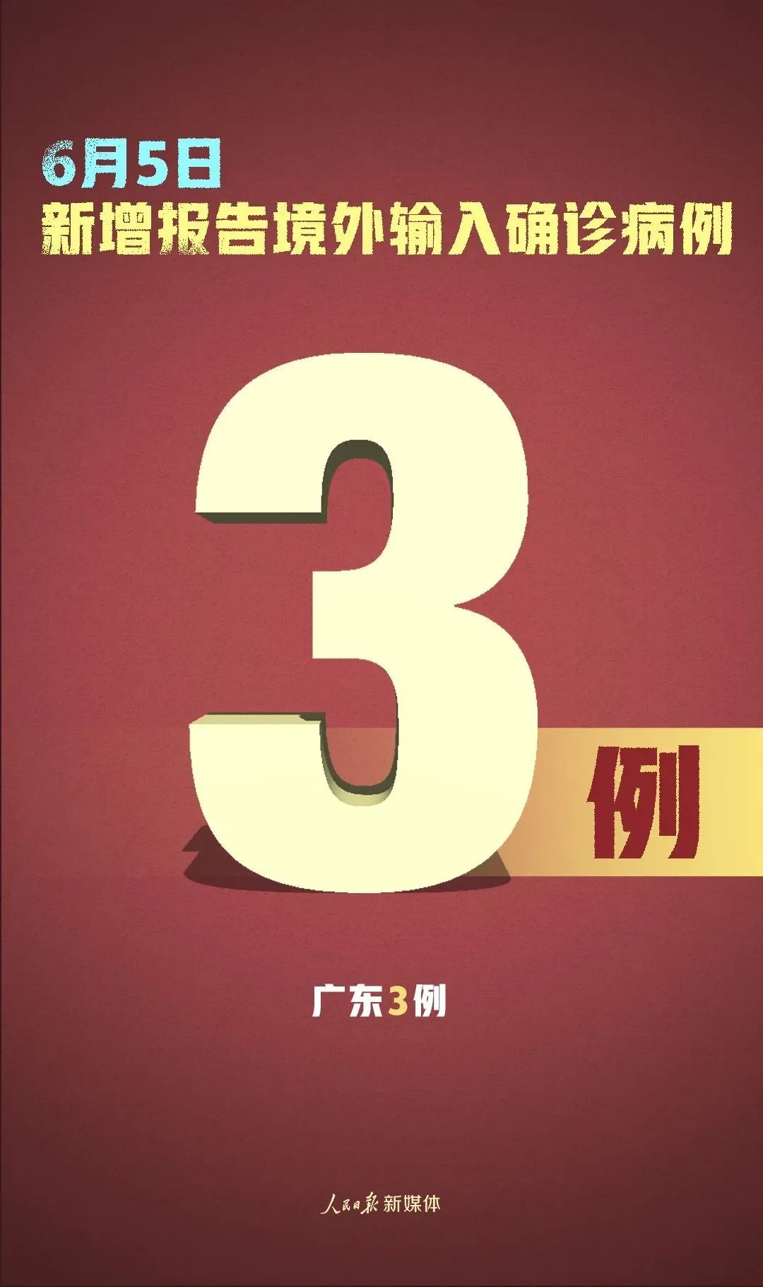 6月5日0-24時(shí),31個(gè)?。ㄗ灾螀^(qū)、直轄市)和新疆生產(chǎn)建設(shè)兵團(tuán)報(bào)告新增確診病例3例,均為境外輸入病例(廣東3例);無新增死亡病例;新增疑似病例1例,為境外輸入病例(上海1例)。