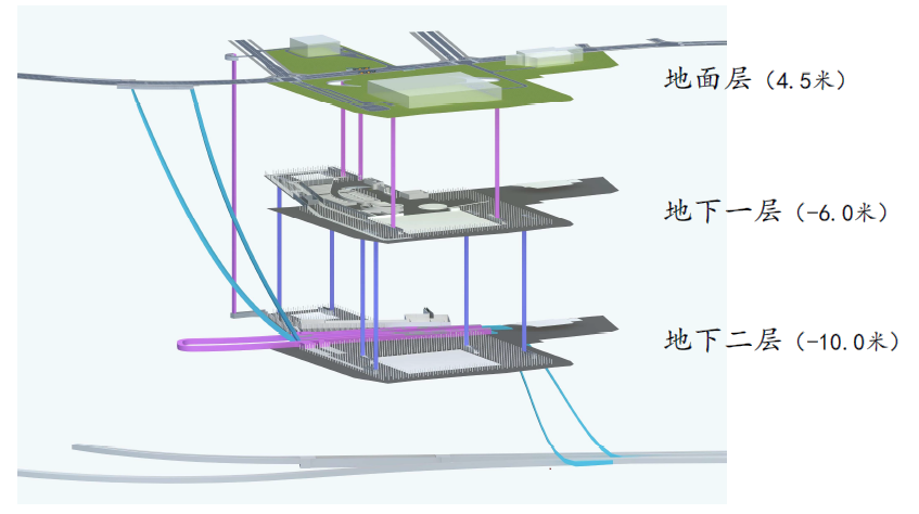 建議地下一層作為人行層和與地鐵銜接的交通樞紐層,地下二層作為主要交通層;在地下二層設置交通環(huán)島,實現地下空間與望海路地下快速路連接。