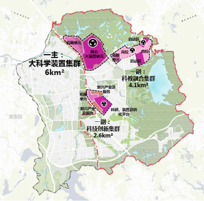 “一副”即科教融合集群。規(guī)劃面積4.1平方公里,是科學(xué)城的科教融合區(qū),布局大科學(xué)裝置和高水平大學(xué),作為大科學(xué)裝置近期集中啟動(dòng)區(qū),為近期科學(xué)城建設(shè)提供空間保障。