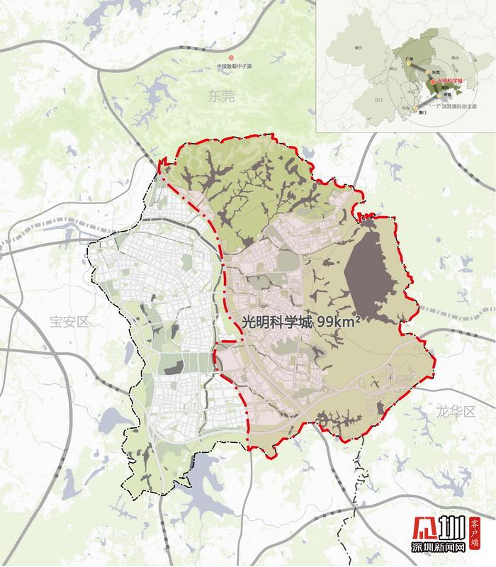 光明科學(xué)城區(qū)位與規(guī)劃范圍示意圖。