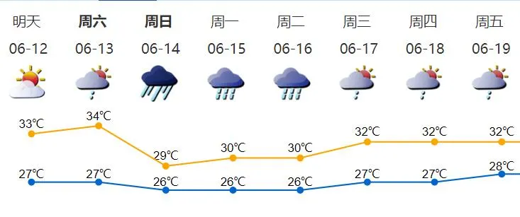 12-13日多云,偶有短時(雷)陣雨,天氣炎熱;14-15日有一次明顯風(fēng)雨過程;16日仍有明顯降雨;17-18日多云,有陣雨或雷陣雨。
