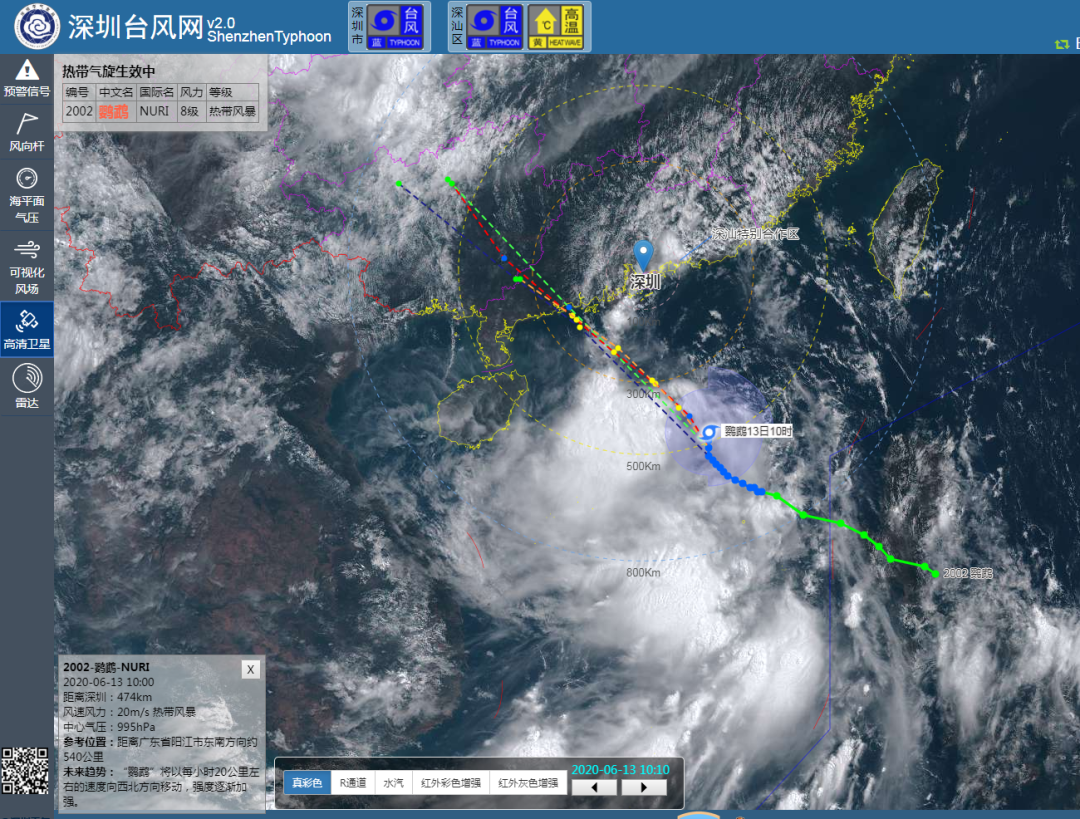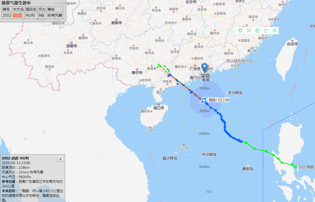 6月13日12時臺風“鸚鵡”(熱帶風暴級)位于深圳市東南方大約446公里的海面上,中心附近最大風力8級。未來24小時趨向江門至茂名附近海域,最大可能在陽江附近登陸。我市13日17時前后起風力逐漸加大,13日夜間至14日上午為風雨主要影響時段。目前臺風藍色預警信號生效中。深圳市氣象臺2020年06月13日12時35分發(fā)布。