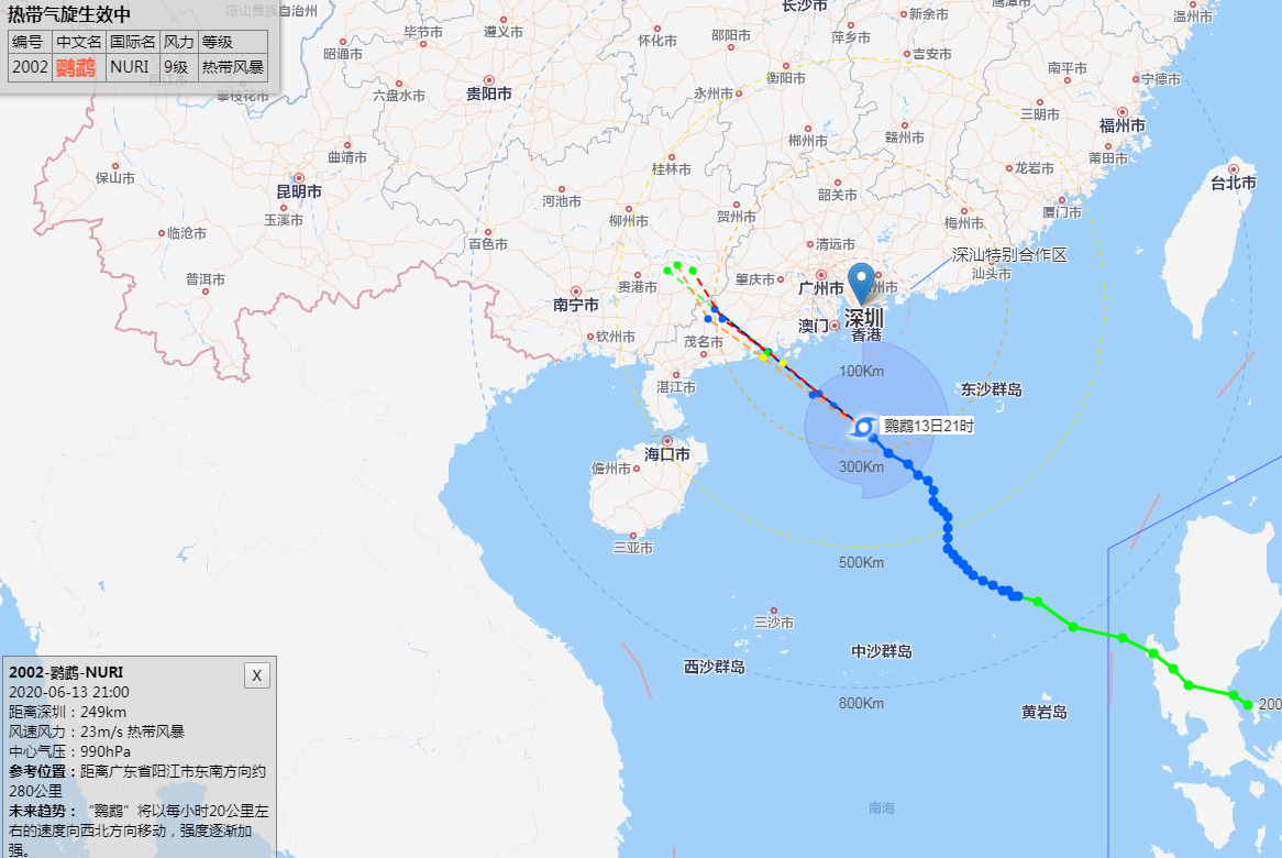 6月13日21時臺風“鸚鵡”(熱帶風暴級)位于深圳市南方約249公里南海海面上,中心附近最大風力9級。預計其將繼續(xù)向西北方向移動,趨向江門至茂名附近海域,最大可能14日上午以強熱帶風暴級在陽江附近登陸。13日夜間起沿海海區(qū)及深汕區(qū)風力逐漸加大,最大風力6-7級,最大陣風8-10級;14日0時至17時有大雨到暴雨,14日夜間起降雨明顯減弱。目前臺風藍色、海浪藍色和雷電預警信號生效中。