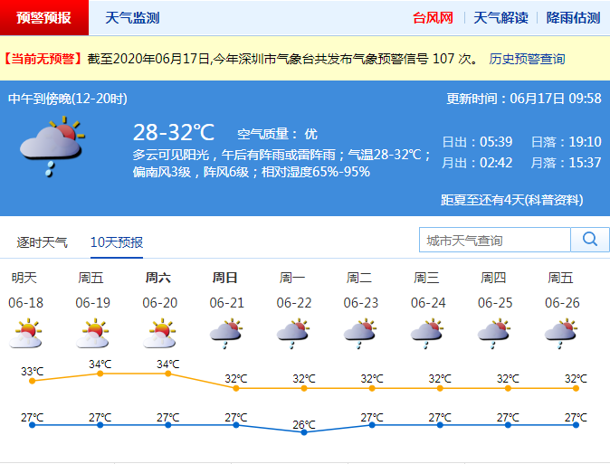 見圳客戶端·深圳新聞網(wǎng)2020年6月17日訊 據(jù)深圳市氣象局消息,6月17日,深圳多云可見陽光,午后有陣雨或雷陣雨;氣溫28-32℃;偏南風(fēng)3級(jí),陣風(fēng)6級(jí);相對(duì)濕度65%-95%。