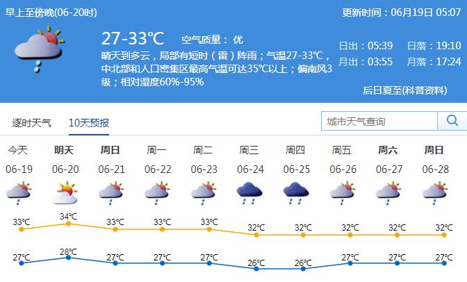 見圳客戶端·深圳新聞網(wǎng)2020年6月19日訊 19日晴天間多云,局部有短時(shí)(雷)陣雨;氣溫27-33℃,北部地區(qū)最高氣溫34-35℃。偏南風(fēng)3級(jí),雨時(shí)短時(shí)陣風(fēng)6級(jí);相對(duì)濕度60%-95%。20日晴天間多云,局地有短時(shí)熱雷雨,天氣悶熱;21-23日多云有雷陣雨。