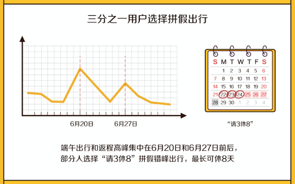今年端午假期集中在周末,不少上班族會(huì)選擇“請(qǐng)3休8”拼假錯(cuò)峰出行,享受8天超長假日。美團(tuán)大數(shù)據(jù)顯示,端午出行和返程高峰分別集中在6月20日和6月27日前后,三分之一用戶會(huì)選擇拼假出行。