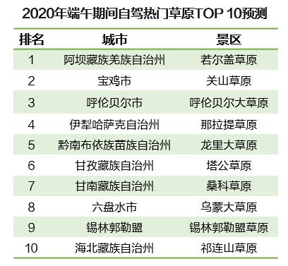 6月正是“草原游”較為適宜的時(shí)節(jié),廣袤的草原游可為這個(gè)夏天增添一絲清涼?!秷?bào)告》預(yù)測(cè),端午小長(zhǎng)假期間,全國(guó)熱門(mén)自駕草原TOP10主要分布在市郊,最熱門(mén)的是阿壩-若爾蓋草原,其次是寶雞-關(guān)山草原以及呼倫貝爾大草原。
