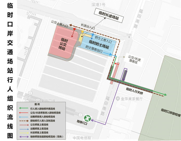 由深圳出境去往香港的行人流線為“交通接駁場站落客位/皇崗口岸地鐵站C出口→臨時(shí)人行天橋→臨時(shí)口岸旅檢樓→香港”,香港入境到達(dá)深圳的行人流線為“臨時(shí)口岸旅檢樓→臨時(shí)人行天橋→交通接駁場站上客位/皇崗口岸地鐵站C出口”。詳細(xì)交通組織流線見下圖。