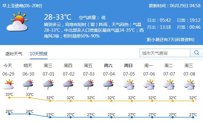 見圳客戶端·深圳新聞網(wǎng)2020年6月29日訊 我市29日晴到多云,局地有短時(雷)陣雨,天氣悶熱;氣溫28-33℃,中北部及人口密集區(qū)最高氣溫34-35℃;西南風(fēng)3級;相對濕度60%-90%。