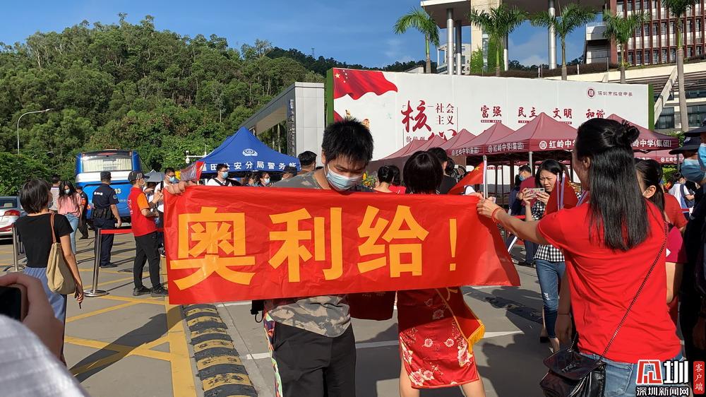 【紅嶺中學(xué)】考生學(xué)長(zhǎng)來到考點(diǎn)門口為學(xué)弟舉起“奧利給”的旗子。