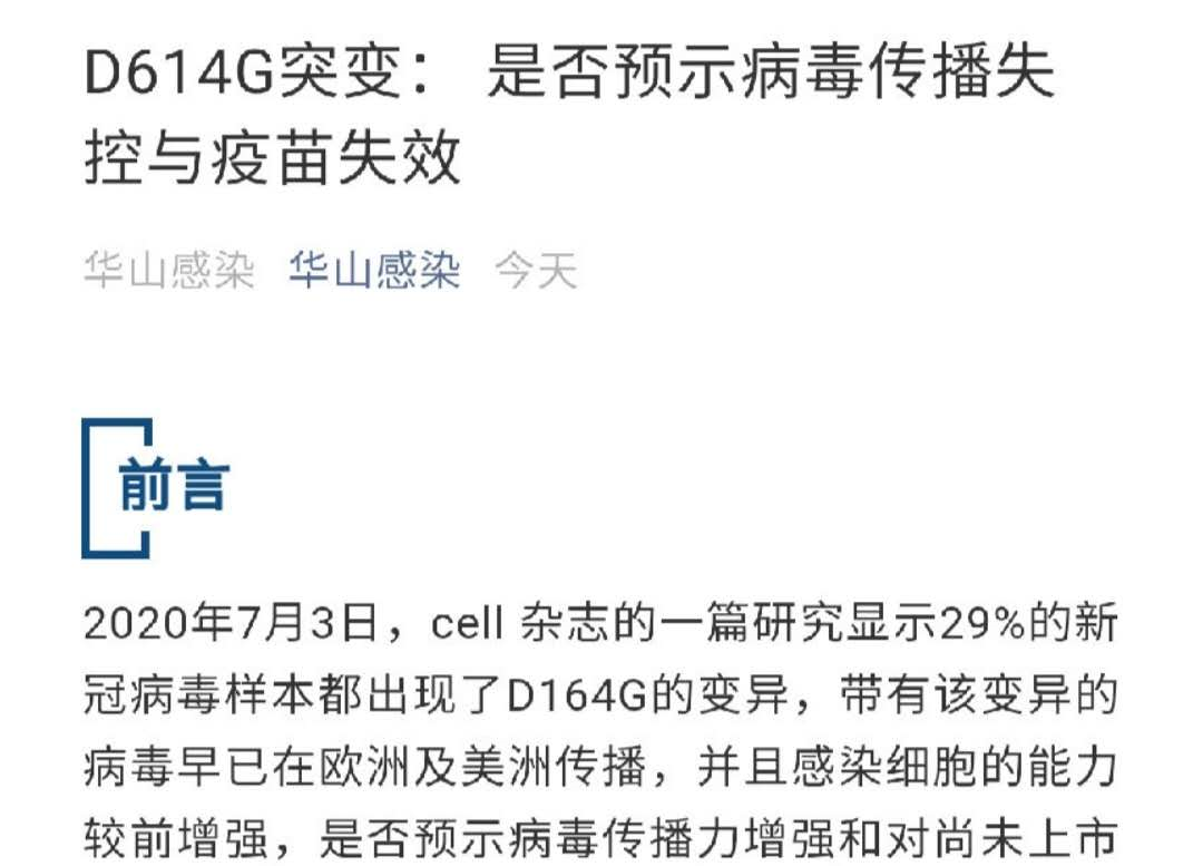 7月6日,上海復(fù)旦大學(xué)附屬華山醫(yī)院感染科主任張文宏通過(guò)微博談“29%新冠病毒樣本現(xiàn)D614G變異”一事。