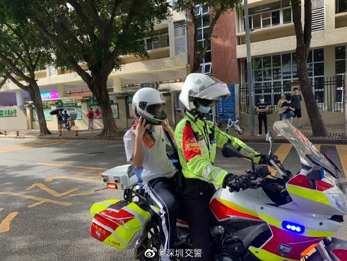 一考生遇早高峰擁堵,距離開考還有十分鐘,@深圳福田交警鐵騎搭載考生順利到達(dá)考場(chǎng)。