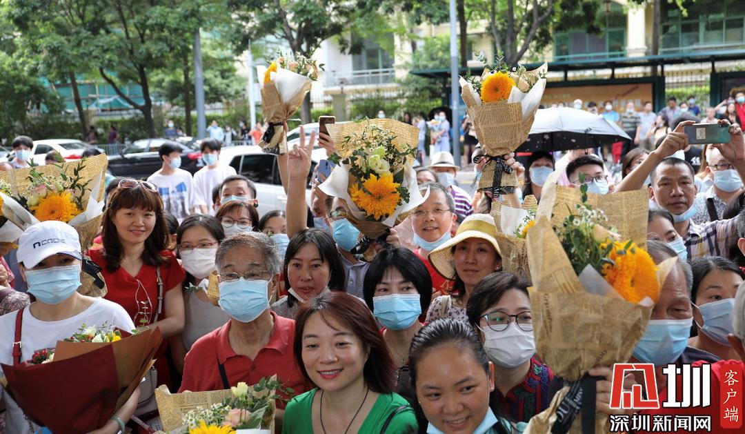 深圳高級中學(xué)考點外家長受捧鮮花、滿懷期待。