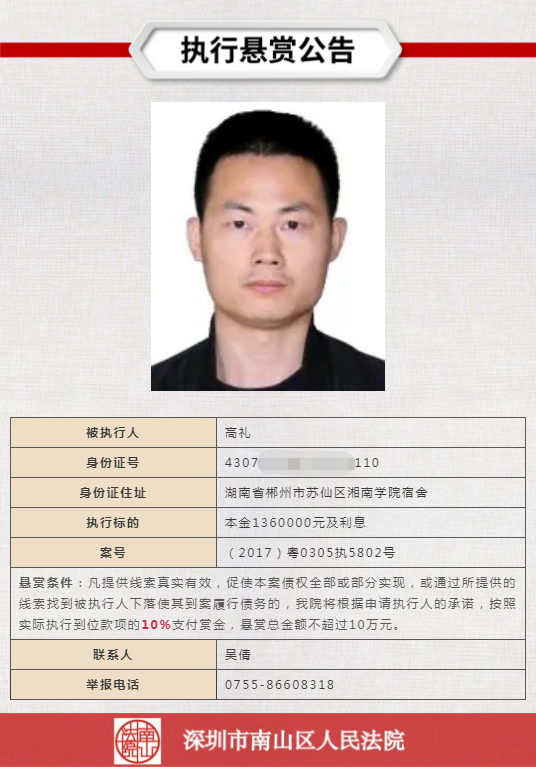 經(jīng)申請執(zhí)行人申請,深圳市南山區(qū)人民法院向社會發(fā)布懸賞舉報公告,凡提供線索真實有效,促使本案債權(quán)全部或部分實現(xiàn),或通過所提供的線索找到被執(zhí)行人下落使其到案履行債務(wù)的,深圳市南山區(qū)人民法院將根據(jù)申請執(zhí)行人的承諾,按照實際執(zhí)行到位款項給予一定金額的賞金。