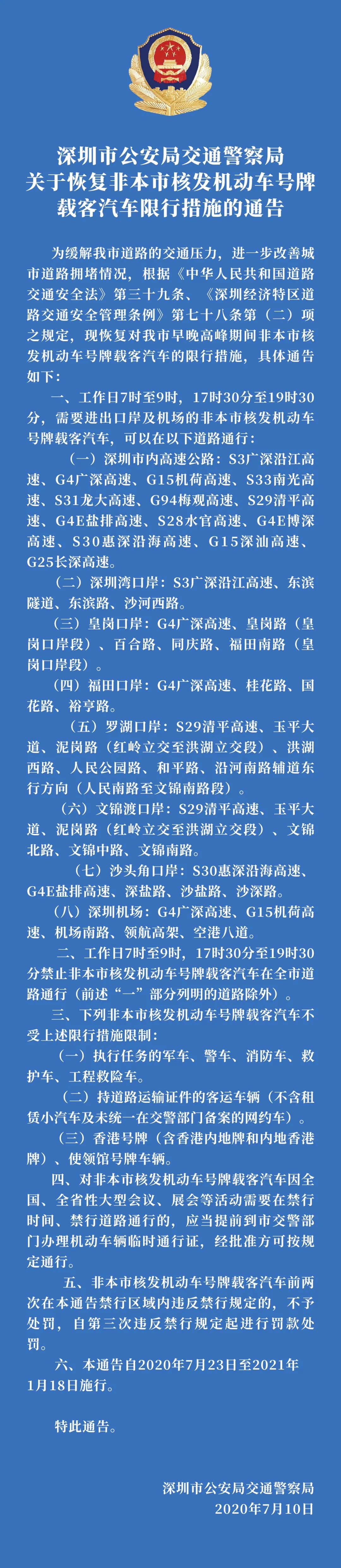 見圳客戶端?深圳新聞網(wǎng)2020年7月15日訊(見圳客戶端、深圳新聞網(wǎng)記者 張喆 陳彥如 實習(xí)生 廖章霖)7月15日,記者從深圳市交警支隊了解到,7月23日開始深圳將恢復(fù)“限外令”,對非深號牌小型載客汽車恢復(fù)限行。本次“限外令”與此前保持一致,除全市高速公路和部分疏港通道不限行以外,全市所有道路在早7:00-9:00和晚17:30-19:30高峰時段對所有非深圳號牌載客汽車實施限行。
