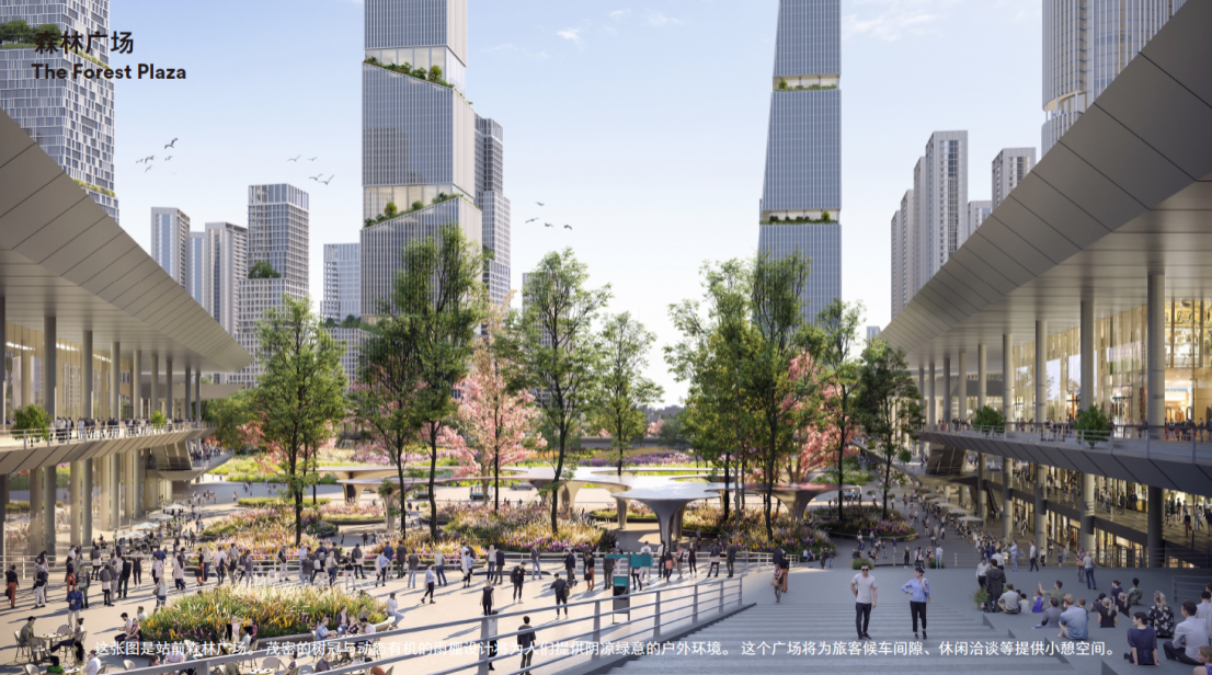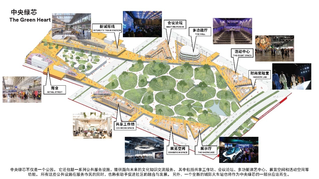 方案以獨特的“綠鏈都芯”為理念,打造一個耦合生態(tài)、交通和公共生活的超級樞紐。設(shè)計的中央綠芯引入大面積森林和草甸,使人們在城市中重遇自然,讓北站樞紐地區(qū)既擁有大城市商務(wù)中心區(qū)的特質(zhì),也擁有郊外自然的品質(zhì),形成全新的都市生活體驗。同時,中央綠芯還包括會議論壇、多功能演藝中心等一系列公共服務(wù)設(shè)施,提供面向未來的文化知識交流服務(wù)。
