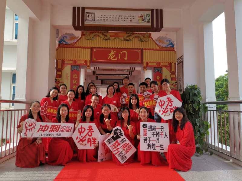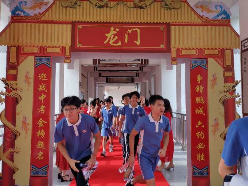龍崗六約學(xué)校全體行政人員與九年級老師,穿著紅色送考服送考,寓意“鴻運當頭”。九年級學(xué)生走過龍門,踏上紅地毯,自帶炫酷出場bgm。(記者李麗