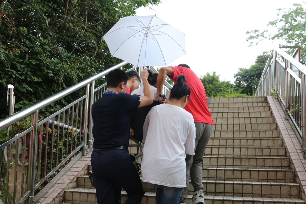 東升學(xué)??键c(diǎn)有一位行動(dòng)不便的考生,學(xué)校派三名工作人員提前護(hù)送考生到考場。 (記者李麗