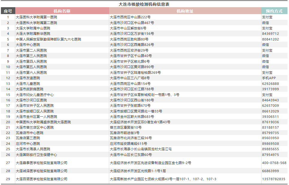 7月24日起,大連市人員原則上實施非必要不離連,確需離連的,須持7日內(nèi)核酸檢測陰性證明;冷藏冷凍肉品、海產(chǎn)品企業(yè)或場所從業(yè)人員盡快實施核酸檢測。大連市對外核酸檢測機(jī)構(gòu)現(xiàn)有29家,機(jī)構(gòu)地址和預(yù)約方式,市民可登錄大連市衛(wèi)生健康委官方網(wǎng)站進(jìn)行查詢。