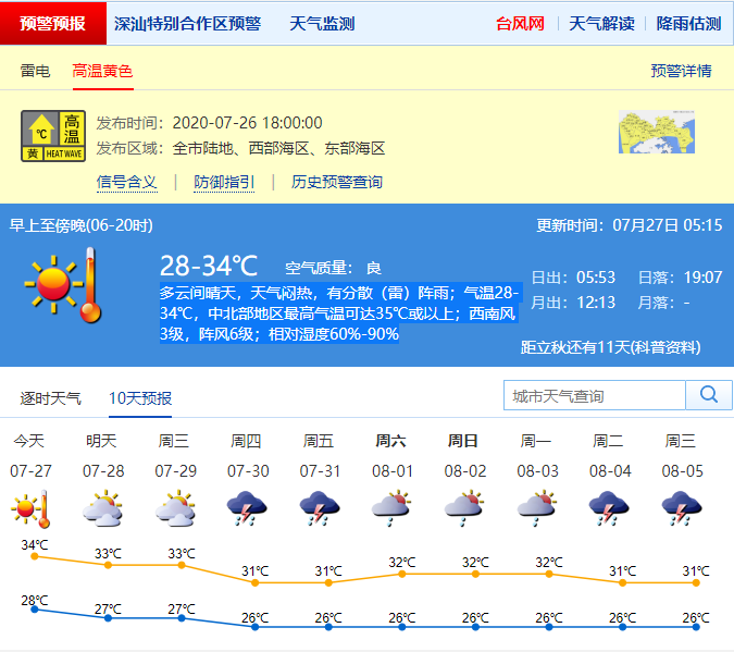 見圳客戶端?深圳新聞網2020年7月27日訊 根據深圳氣象局官方消息,深圳7月27日白天多云間晴天,天氣悶熱,有分散(雷)陣雨;氣溫28-34℃,中北部地區(qū)最高氣溫可達35℃或以上;西南風3級,陣風6級;相對濕度60%-90%。