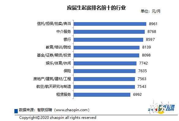 報(bào)告顯示,應(yīng)屆生起薪排名前十的行業(yè)中,信托/擔(dān)保/拍賣/典當(dāng)、中介服務(wù)、銀行等行業(yè)為起薪排名前三名,分別為8961元,8768元和8597元。除此之外,教育/培訓(xùn)/院校、娛樂/體育/休閑等受益于直播經(jīng)濟(jì)的帶動(dòng)和數(shù)字化的發(fā)展,也向應(yīng)屆生開出了相對(duì)高的薪酬。