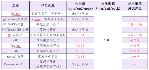 值得注意的是,在測試的10款家用美容儀樣品中6款樣品鎳釋放量測試結(jié)果不符合歐盟REACH法規(guī)要,包括KEONBASO康堡仕微電緊膚小臉儀、ReFa黎琺雙球滾輪波光美顏美容儀、MKE凈顏嫩膚美容儀、Notime凈顏嫩膚美容儀、SKG面膜精華導入儀、YA-MAN雅萌家庭用美容器。