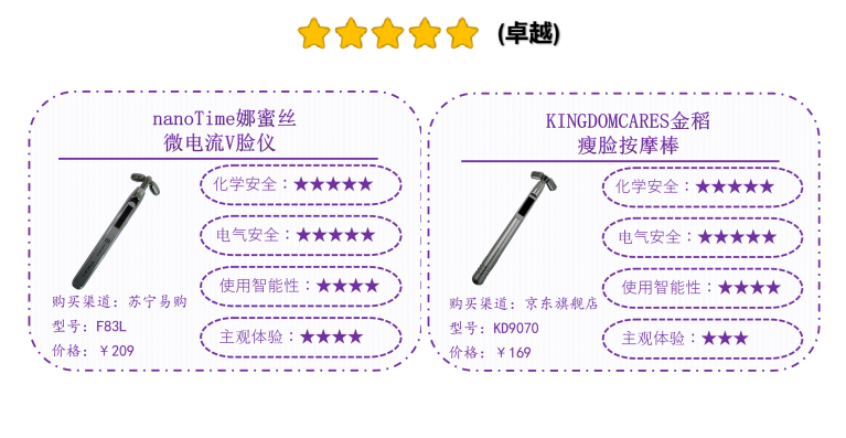 經(jīng)測試,綜合化學安全、電氣安全、使用智能性、主觀體驗等消費者關(guān)心的多個維度,2款微電流型家用美容儀和1款電離子型美容儀品質(zhì)領(lǐng)跑表現(xiàn)卓越,分別為,國產(chǎn)品牌nanoTime娜蜜絲F83L微電流V臉儀和KINGDOMCARES金稻 KD9070瘦臉按摩棒;日本品牌Panasonic松下 EH-ST50面部護理器(溫熱離子美容儀)。