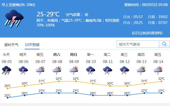 見(jiàn)圳客戶端·深圳新聞網(wǎng)2020年8月5日訊 今日我市陰天,有暴雨;氣溫25-29℃;偏南風(fēng)3級(jí);相對(duì)濕度70%-100%。深圳市氣象臺(tái)于2020年8月5日5時(shí)15分在全市發(fā)布雷電預(yù)警,今天上午海上將不斷有降雨云團(tuán)生成,受其影響我市有零散雷暴;未來(lái)6小時(shí)累計(jì)雨量將達(dá)暴雨,深圳市氣象臺(tái)于2020年8月5日5時(shí)40分在全市發(fā)布暴雨黃色預(yù)警,全市進(jìn)入暴雨戒備狀態(tài),需注意防范。市民停留在安全地方;按照防御預(yù)案停止戶外易燃易爆危險(xiǎn)作業(yè),并加強(qiáng)危化場(chǎng)所安全管理。