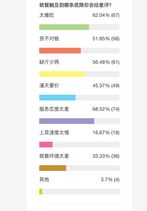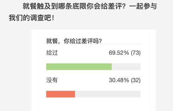 用餐后做出評價,是消費者的基本權(quán)利。針對“就餐差評”的問題,深圳新聞網(wǎng)昨天發(fā)起了網(wǎng)友投票。結(jié)果,有69.52%的網(wǎng)友表示,他們曾經(jīng)在用餐后給過差評。在給出差評的原因中,“服務(wù)態(tài)度差”、“太難吃”高居前兩名。對商家提出中肯的批評與監(jiān)督,是每個消費者享有的基本權(quán)利,中肯的評價不僅是商家進(jìn)步的動力,也讓更多網(wǎng)友能夠快速篩選定位商家,從而促進(jìn)行業(yè)的良性發(fā)展。
