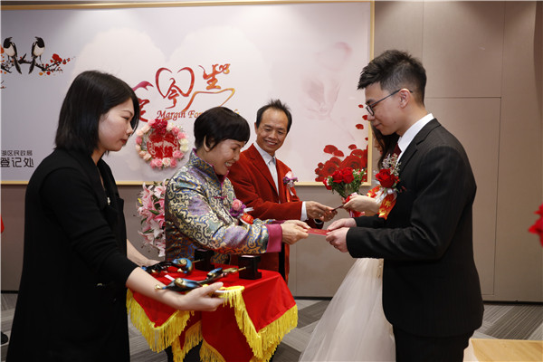 當(dāng)天,區(qū)委常委、宣傳部部長呂漫妮,區(qū)政府副區(qū)長左金平和銀婚老人楊明剛、李玉芳夫婦從區(qū)民政局局長楊文秀手中接過聘書,正式成為羅湖區(qū)結(jié)婚登記特邀頒證師,四位特邀頒證師依次為12對新人頒發(fā)結(jié)婚證,送上誠摯祝福。