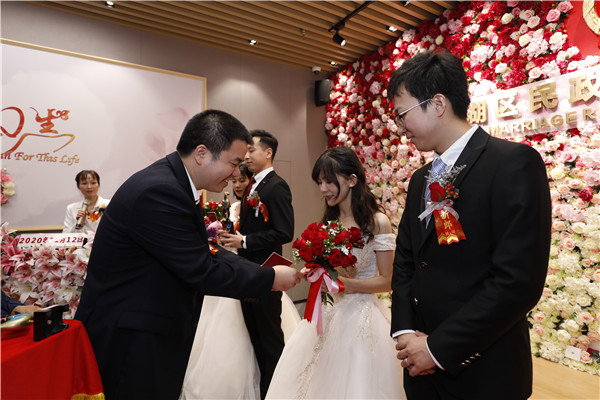 “我們是今年2月份在一起的,因為疫情的原因,讓我們彼此更加知道‘珍惜眼前人’的含義,就像我在誓詞中說的那樣,未來我會用盡一生來愛她,我也會對她誠實,對她的家人尊重和照顧就像對我的家人一樣,未來我們一定會健康地走下去?!痹诓稍L中,肖先生說道,選擇在“雙十二”結(jié)婚是因為今年是特別的一年,想在最后的一個月的雙數(shù)日子里領(lǐng)證,留下美好的回憶。