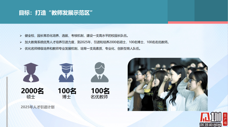 在人才隊伍方面,實施“領(lǐng)鷹工程”,建設(shè)一支高水平的校園長隊伍。優(yōu)化名師梯級培養(yǎng)和教師專業(yè)發(fā)展機制,培育一支高素質(zhì)、專業(yè)化、創(chuàng)新型育人隊伍。到2025年,羅湖將引進(jìn)和培養(yǎng)2000名碩士、100名博士、100名名優(yōu)教師,建立教科研博士工作站。