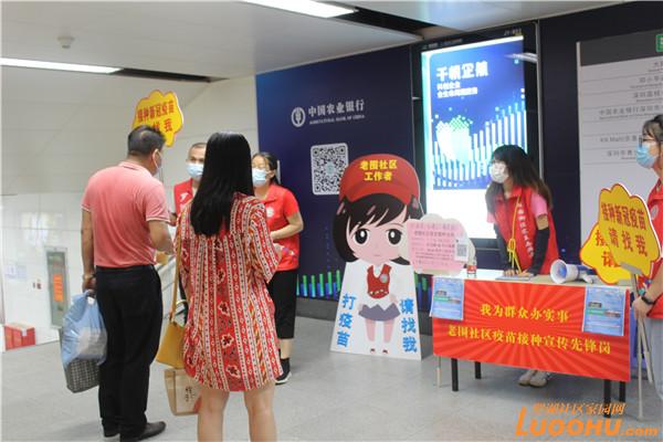 客運(yùn)繁忙的大劇院地鐵站就在老圍社區(qū),老圍社區(qū)黨委就把“疫苗接種宣傳先鋒崗”從小區(qū)卡口擴(kuò)展到地鐵口。在川流不息的地鐵口,宣傳崗上的大字“我為群眾辦實(shí)事,老圍社區(qū)疫苗接種宣傳先鋒崗”,金光閃閃格外醒目。旁邊的小喇叭循環(huán)播放:“接種疫苗人人有責(zé),打第二針疫苗請找我,不用排隊(duì)不用預(yù)約,專車接送?!?/p>