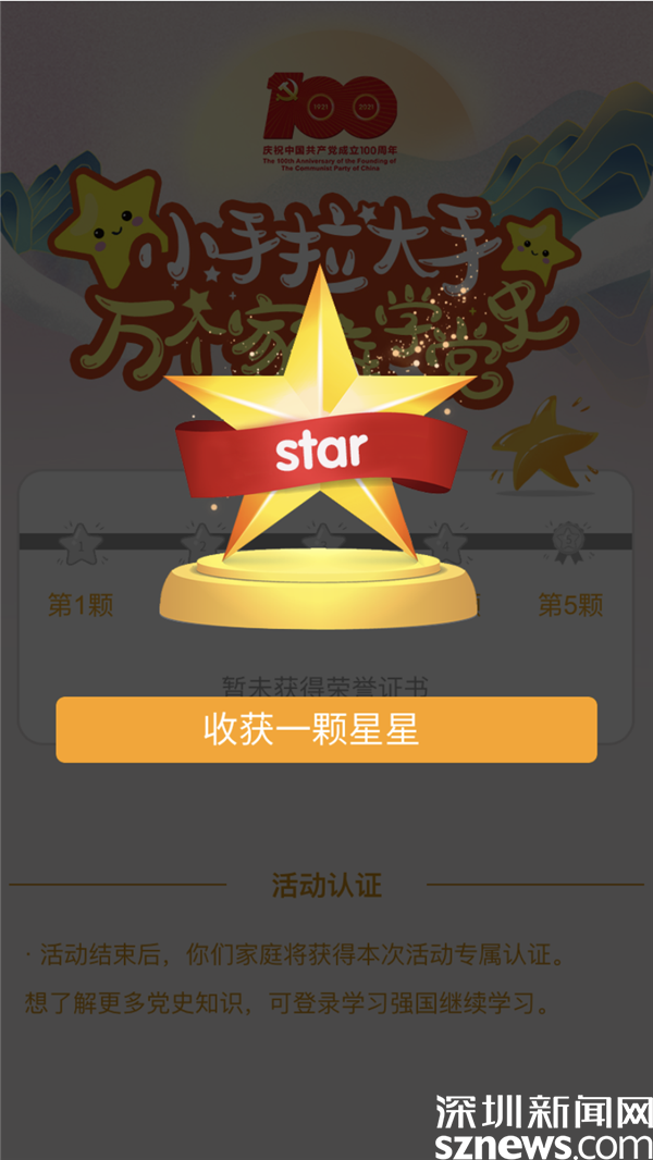 本次活動(dòng)面向羅湖轄區(qū)中小學(xué)學(xué)生及家庭。6月28日至7月8日,學(xué)生及家長(zhǎng)可以下載“羅湖Plus”APP,點(diǎn)擊首頁(yè)“服務(wù)”進(jìn)入“小手拉大手黨史學(xué)習(xí)”活動(dòng)專欄并完成注冊(cè)?;顒?dòng)期間,每完成1次打卡即答對(duì)全部題目,可獲得1次親子“點(diǎn)亮星星”的機(jī)會(huì)。每輪答題如有1道答錯(cuò)即為“闖關(guān)失敗”,可以點(diǎn)擊“再來(lái)一次”繼續(xù)答題,直到全部答對(duì)為止。10天內(nèi)完成5次打卡任務(wù),即可點(diǎn)亮5顆小星星獲得“升旗手”個(gè)人榮譽(yù)證書。