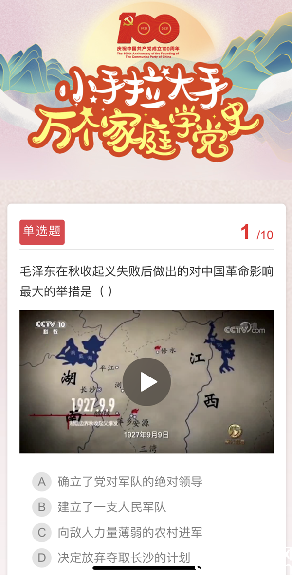 此次羅湖區(qū)率先通過(guò)區(qū)級(jí)融媒客戶端創(chuàng)新推出黨史學(xué)習(xí)教育“親子學(xué)習(xí)”模式,學(xué)生及家長(zhǎng)共同參加,將黨史學(xué)習(xí)和家庭教育結(jié)合。題目類型上創(chuàng)新“圖+文+影”多種形式,包括看圖文答題,觀看革命題材電影片段等,題目?jī)?nèi)容涵蓋黨史、新中國(guó)史、創(chuàng)建文明城市等。