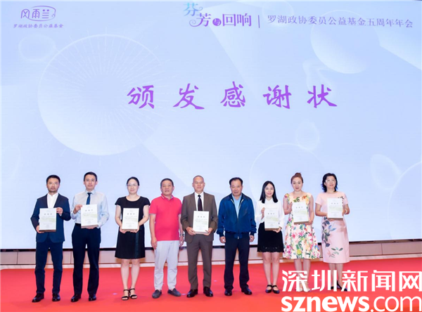 活動最后,與會領導向深圳壹基金公益基金會、羅湖社會創(chuàng)新空間和區(qū)政協(xié)歷屆港澳委員聯(lián)誼會等10個相關友好單位和個人頒發(fā)了感謝狀;向熱心社會公益、積極捐助善款的19名政協(xié)委員代表頒發(fā)慈善獎。