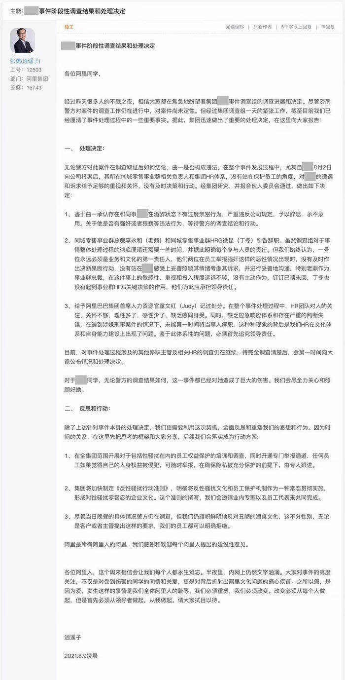 阿里張勇回應“女員工被侵害”:震驚氣憤羞愧,必須調(diào)查清楚