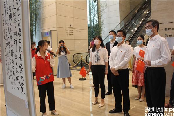 展覽活動以深圳市人大代表?xiàng)顦犯吒枰磺洞禾斓墓适隆防_了序幕,兩位黨史講解員也是老圍社區(qū)年輕的黨員代表,她們以中國共產(chǎn)黨百年歷史紅色基因傳遞者的身份,以聲情并茂的講解,將與會人員帶到一排排精美的字畫前。從紅船開始到百年華誕,從東江縱隊(duì)精神至今日全民抗疫,還有40年深圳改革開放的日新月異,無不記錄了百年黨史每一個階段的精彩瞬間,每一幅作品都令人難忘。